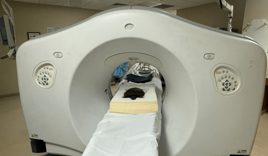 Upon arrival at the hospital, the gopher tortoise was prepared for a CT scan, designed to provide a comprehensive internal view without interference from her shell. A thoughtfully created custom foam pillow ensured her comfort and stability during the process, with a cutout matching her body shape.