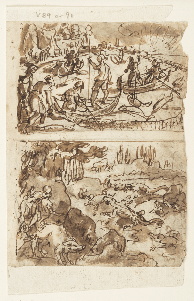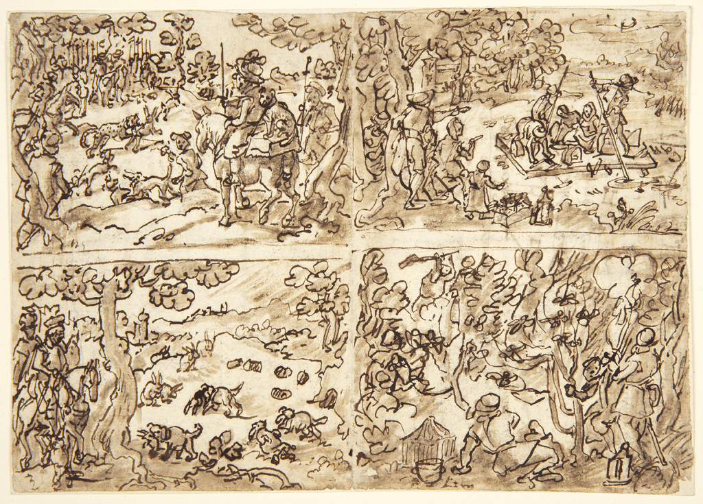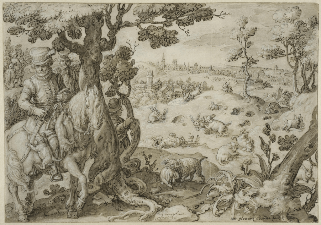 Following the sketches, Stradanus would create a more polished drawing known as a modello—a detailed blueprint for the printmaker. This refined version for the rabbit hunt, preserved at the Nationalmuseum in Stockholm, illustrated a wealth of detail. It meticulously outlined textures, shadows, and spatial relationships, forming a precise guide for the engraver Theodor Galle, who would ensure that the intricacies were replicated in the final print.